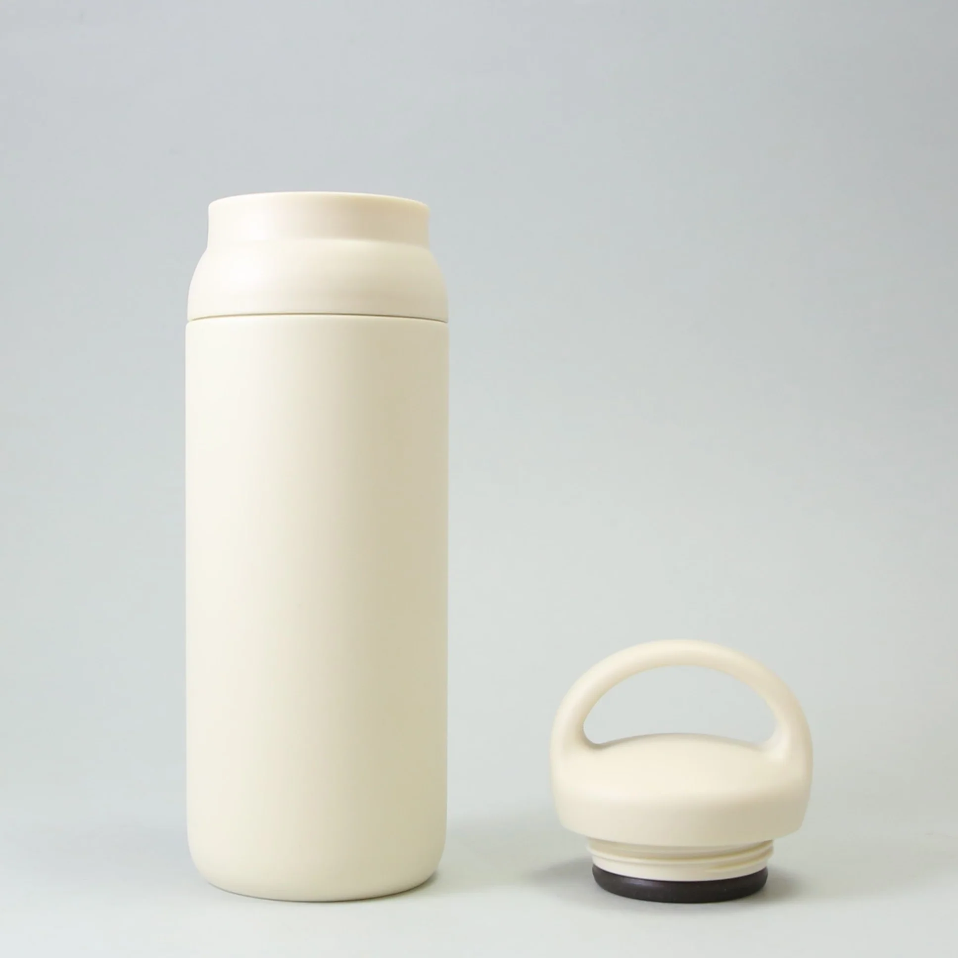 A double walled stainless steel travel tumbler from Japanese brand Kinto. Can keep drink hot or cold for up to 6 hours. Metal body with a plastic twist off lid.